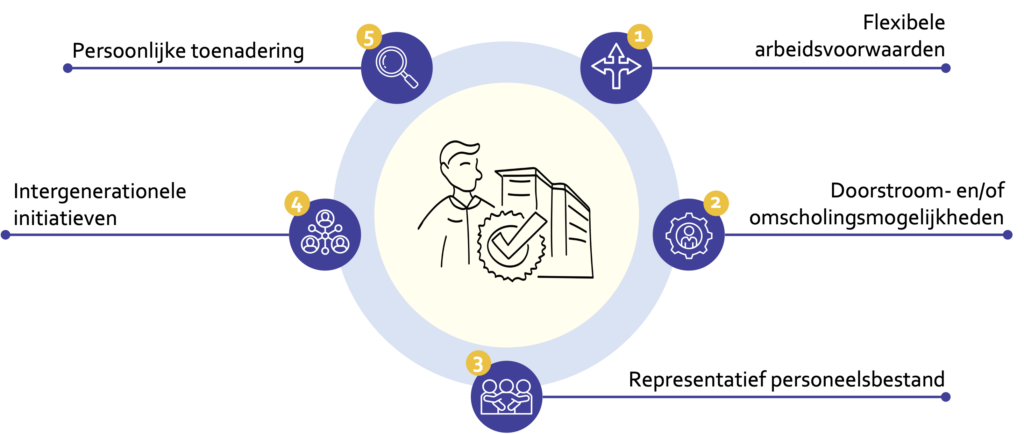 Werkgevers zijn steeds meer bereid om oudere werknemers tegemoet te komen en te investeren in diversiteit en inclusie, maar weten vaak niet hoe. Daarom maken wij aan de hand van vijf pijlers inzichtelijk hoe een leeftijdsinclusieve werkomgeving eruit ziet.